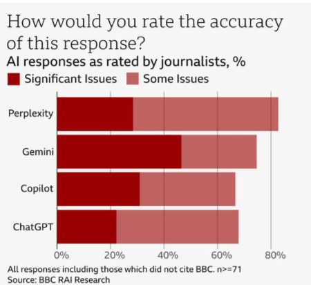 En 2024, la BBC a mené une expérience fort intéressante, s’informer sur l’actualité en consultant des chatbots. C’est ce qui qui est rapporté dans cet article du Guardian publiée en février 2025 : AI chatbots distort and mislead when asked about current affairs, BBC finds | Artificial intelligence (AI) | The Guardian